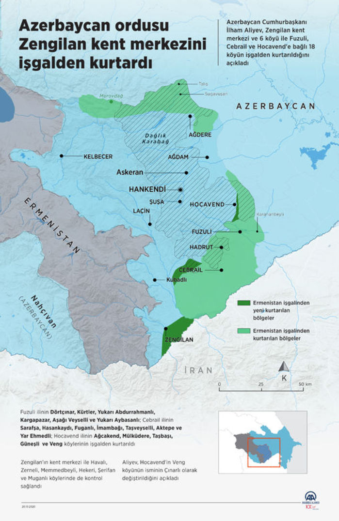 Azerbaycan, Ermenistan işgali altında bulunun topraklarını geri almak için başlattığı operasyonlarını kararlılıkla sürdürüyor. Azerbaycan Cumhurbaşkanı İlham Aliyev, resmi Twitter hesabı üzerinden yaptığı açıklamada, Cebrayıl bölgesinde Belend, Papı, Tulus, Hacılı, Tinli köyleri, Fuzuli bölgesinde Gecegözlü, Aşağı Seyidehmedli, Zerger köyleri, Zengilan bölgesinde ise Mincivan kasabası, Hurama, Humarlı, Sarıl, Babaylı, Üçüncü Ağalı, Hacallı, Qırah Müşlan, Üdgün, Turabad, İçeri Müşlan, Melikli, Cahangirbeyli ve Baharlı köyü işgalden kurtarılmıştır. Yaşasın Azerbaycan Ordusu! Karabağ Azerbaycan'dır!" ifadelerini kullandı.